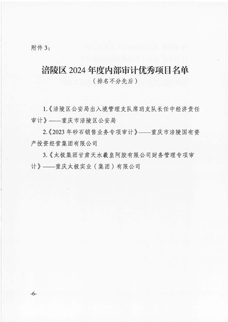 2025年9月,涪陵區(qū)內(nèi)部審計(jì)協(xié)會發(fā)布《關(guān)于表揚(yáng)2024年度先進(jìn)集體、先進(jìn)個(gè)人及內(nèi)部審計(jì)優(yōu)秀項(xiàng)目的通報(bào)》(涪陵內(nèi)審協(xié)發(fā)〔2025〕6號),國投集團(tuán)審計(jì)部獲得“涪陵區(qū)2024年度內(nèi)部審計(jì)先進(jìn)集體”表彰,國投集團(tuán)內(nèi)審項(xiàng)目《2023年砂石銷售業(yè)務(wù)專項(xiàng)審計(jì)》獲得“涪陵2024年度內(nèi)部審計(jì)優(yōu)秀項(xiàng)目”表彰。